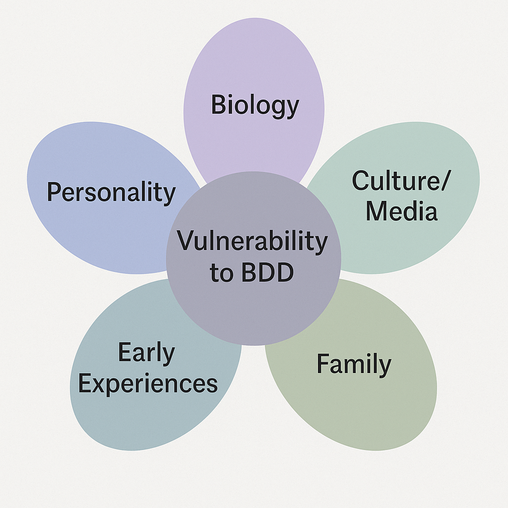 No single petal causes BDD. But when several overlap, the ‘flower’ of BDD grows. Therapists often use this model to help clients reflect on their own petals, which reduces self-blame.